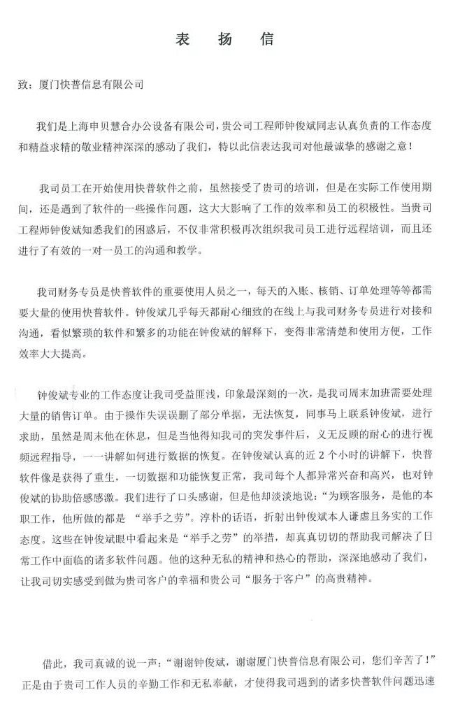 信中提到,申貝慧合財務(wù)人員是快普軟件的重要使用人員之一,每天入賬、核銷、訂單處理等等都需要大量的使用快普軟件。鐘俊斌工程師耐心細(xì)致的與其財務(wù)人員在線上對接溝通,幫助其快速順暢使用軟件,提高工作效率。