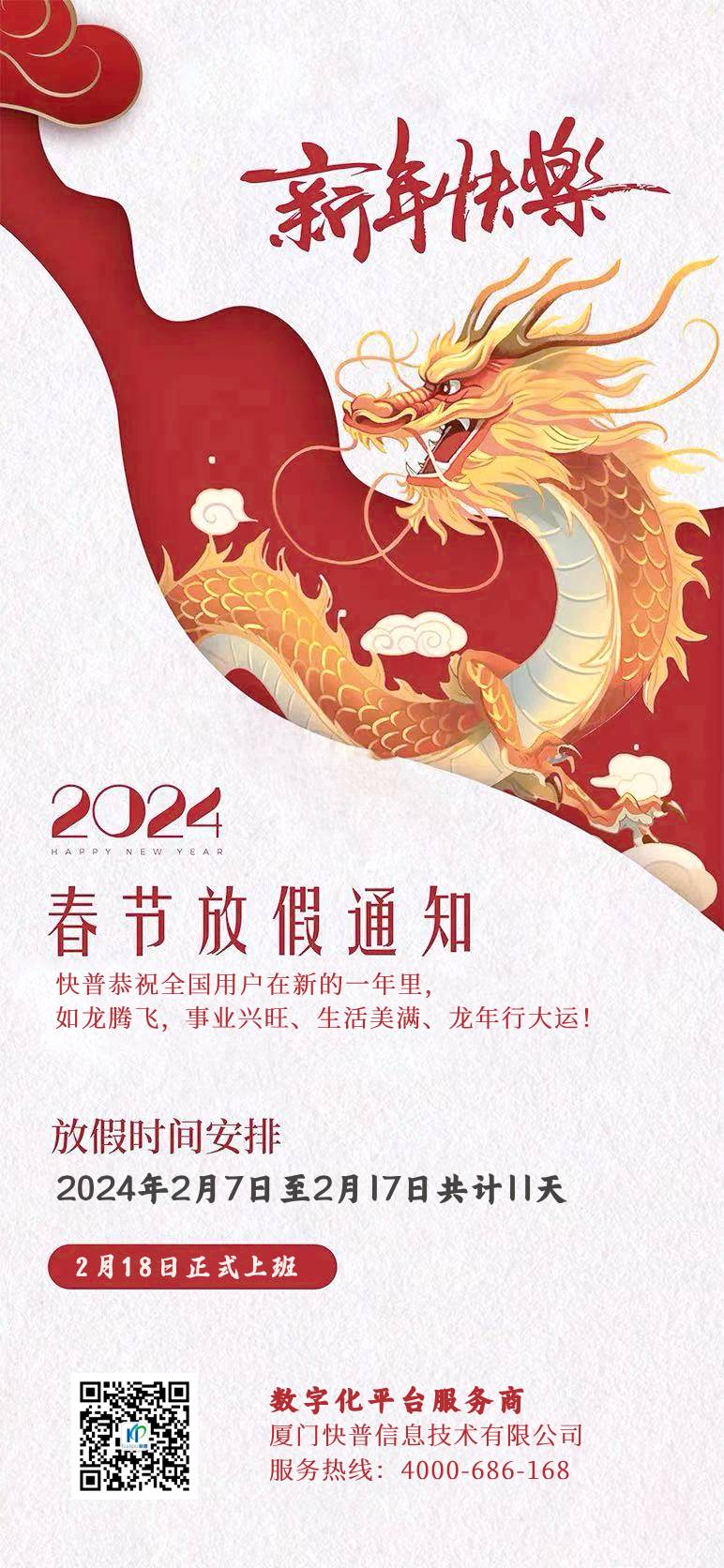 2024年春節(jié)即將到來(lái),快普公司全體員工提前恭??炱沼脩粼谛碌囊荒昀铮堮R精神,龍騰虎躍,事業(yè)如日中天,生活步步高升!感謝您長(zhǎng)期以來(lái)對(duì)我們工作的理解和支持。