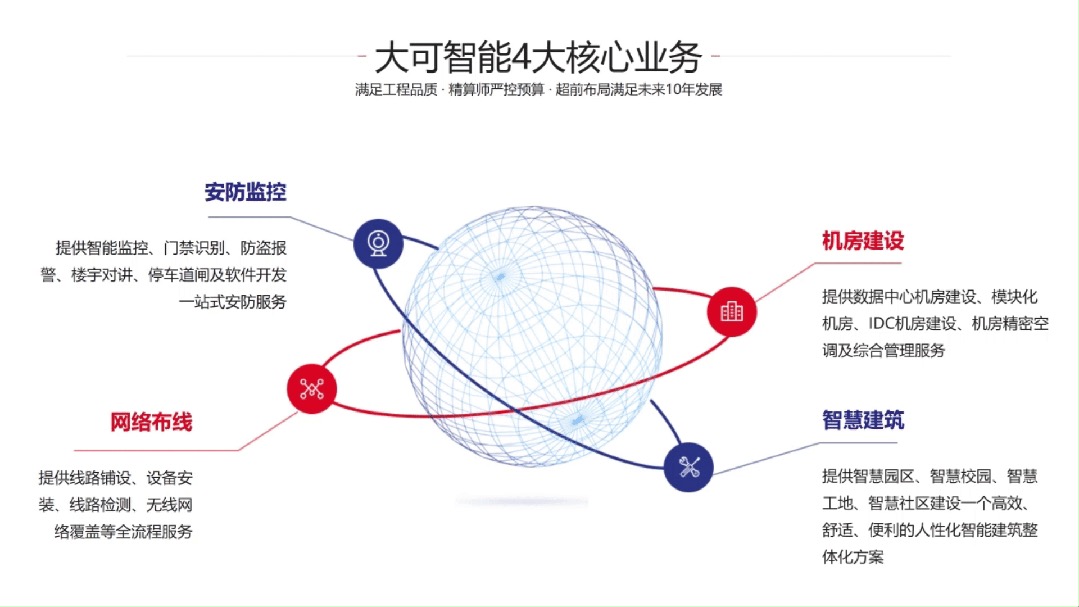 大可智能在行業(yè)內(nèi)率先提出“零分包”管理模式,并且自主要求每一個實施員工執(zhí)行公司制定的標準化施工規(guī)范,有效降低工程的成本,提高運轉(zhuǎn)效率,為客戶提供更高效的咨詢、規(guī)劃、設(shè)計、施工、運維一站式的解決方案。