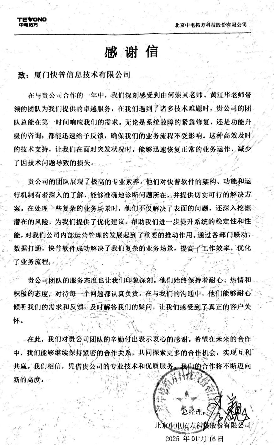 【快普簡訊】 北京中電拓方科技股份有限公司向我司發(fā)來感謝信,對何崇靈老師、黃江華老師帶領(lǐng)的實施小組在過去一年中提供的優(yōu)質(zhì)服務(wù)表示高度認(rèn)可和衷心感謝。來信不僅是對快普實施團隊專業(yè)能力的肯定,更是對快普“客戶至上”服務(wù)理念的詮釋。